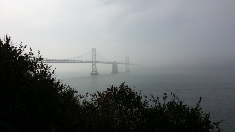 SF is hiding in the fog on the other side of the western span of the Bay Bridge.