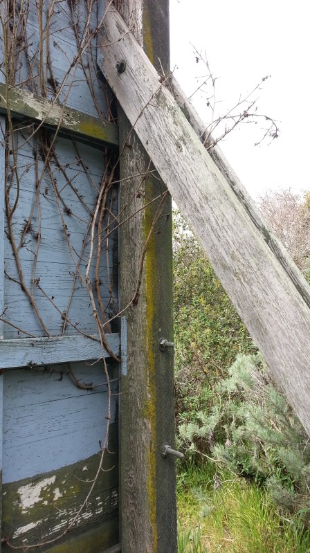 The back of a decrepit old sign along the road.