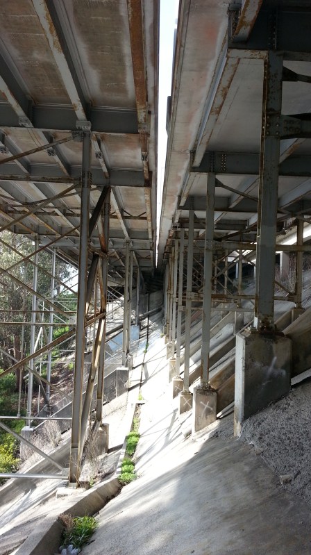 Beneath the roadway, closer to the bridge.