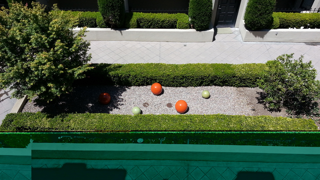 The spheres from above, mimic the topiary forms along the walls and highlight the orange hints in the maple.