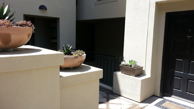 Potted succulents on the pediments jump across the corridor to tie the whole space together.
