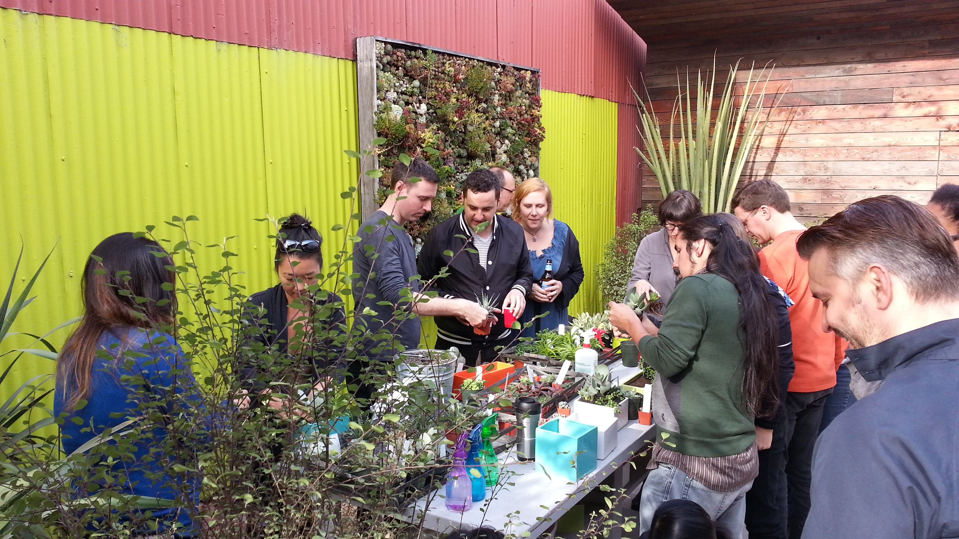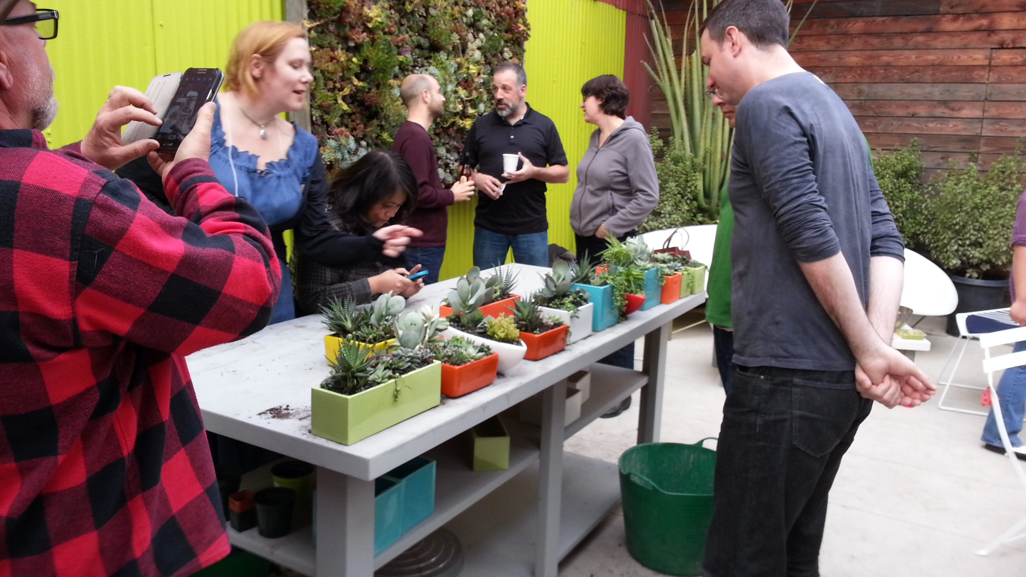 The group were enthusiastic. Patrick and I gave a quick overview of how you can be brutal with succulents to make them conform to your needs, showed how to plant them, discussed their cultural needs, and informed about the tricks of watering them in containers that don’t drain. Then, we turned them loose. A coworker, our events coordinator Jim Kumiega, had gathered a selection of pottery and succulents appropriate for indoor life and centerpieces ahead of the event, with a mind for an average cost per finished piece that had been agreed upon previously. They all paired off and grabbed what appealed to them, and Patrick and I checked back with them regularly to offer additional guidance.