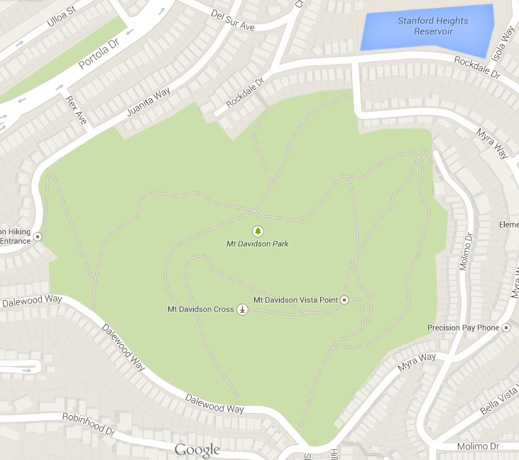 This summer I’ve explored Golden Gate Park, Mount Sutro, Twin Peaks, Glen Canyon, and the forest around Sutro Tower – some of those more than once. I should put some posts together about those. I wanted to visit someplace new to me, so yesterday I went on the longest-distance hike from home that I’ve done in quite some time. All these years, I’ve ridden past the peak of Mt. Davidson, in the center of town, but have never scaled it. I decided it was time for the trek. I grabbed the dogs and went out on the four-hour round trip (though it could easily have taken just 2½ if I’d been on a mission). After plotting my route to get there, I decided the most direct approach was the best, and would save the heaviest climbing for the peak itself. I walked up Market from the Castro, until it turns into Portola. Then, I hung a Louie at the old Tower Market up there, followed Teresita to Isola, then a right on Rockdale at the Stanford Heights Reservoir. The street ends at one of many trails up the hill through the forest.