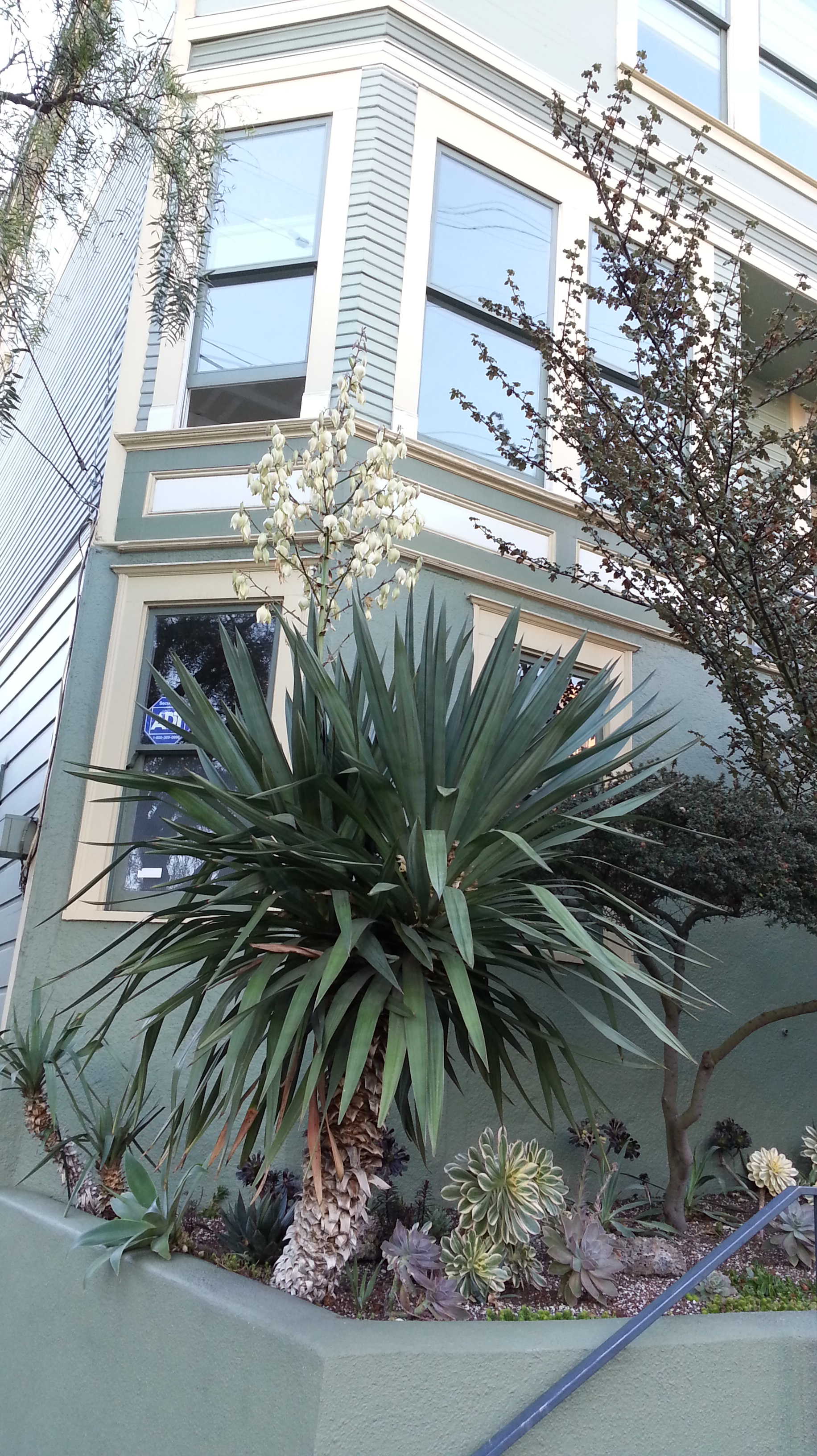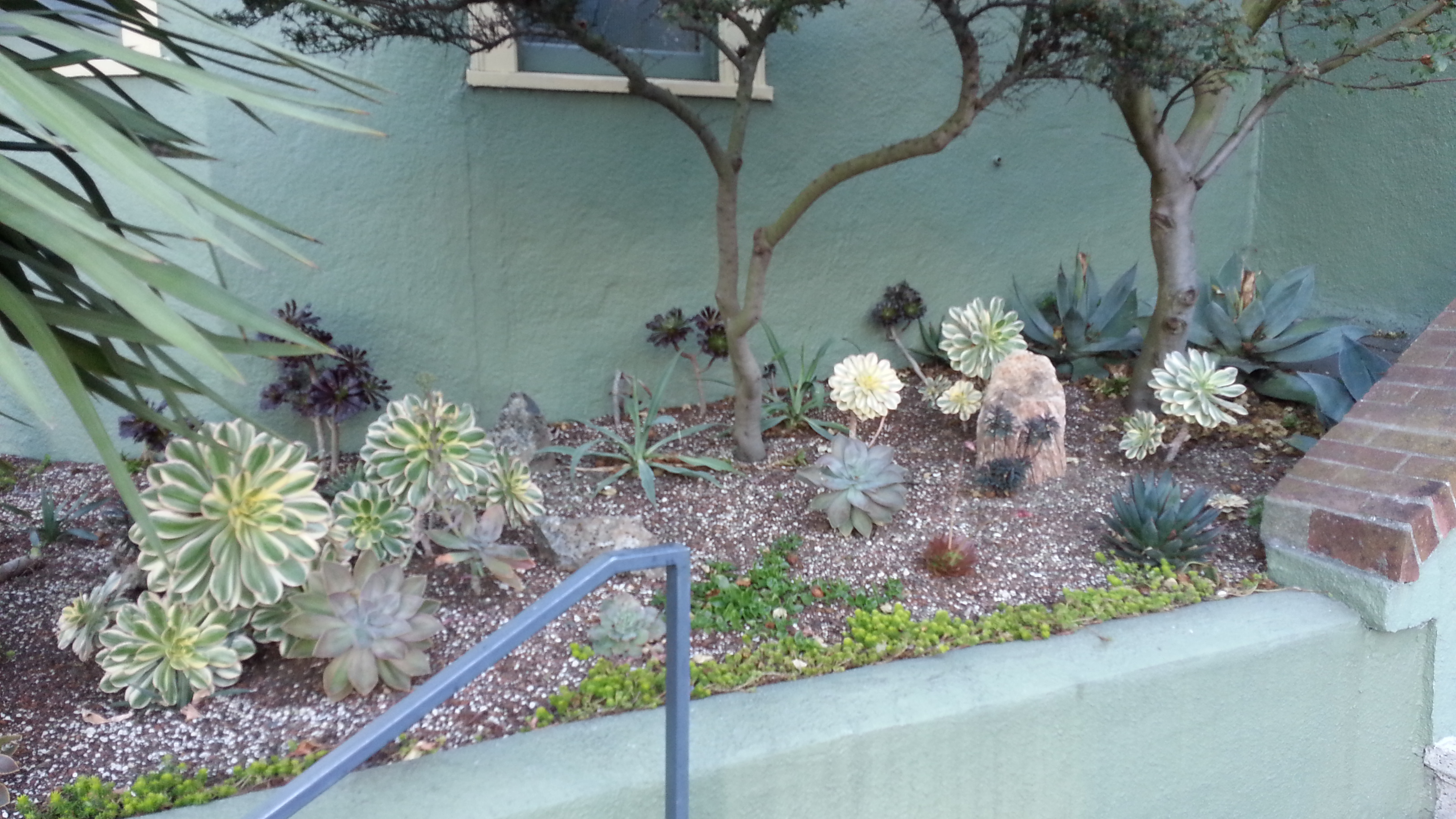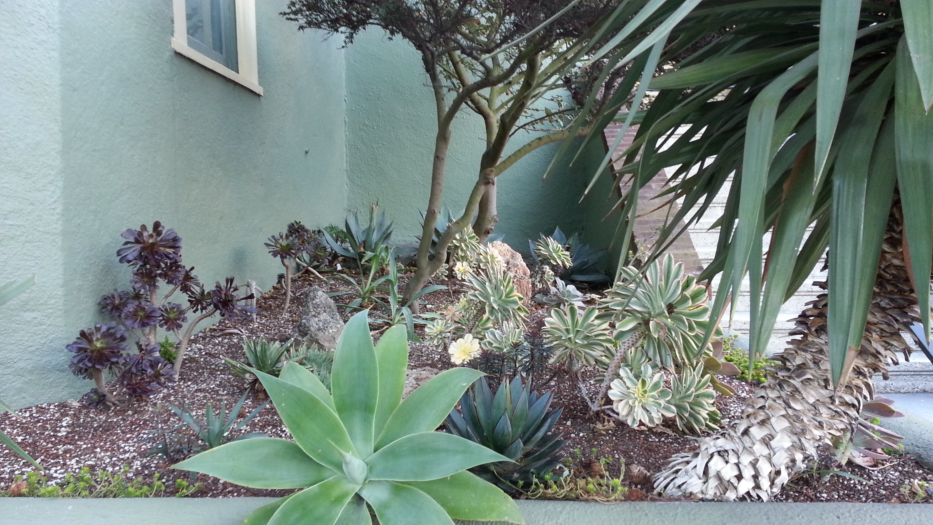 A year ago this week I planted a little postage-stamp of a garden for a neighbor of mine around the corner on Castro, and they recently contacted me to “freshen up” the space. I’d originally planted a succulent garden for them, tucked in under the canopy of their California natives, Ceanothus and Fremontodendron. I just met with them yesterday morning, and thought it would be interesting to report on the process and show what the year has brought.