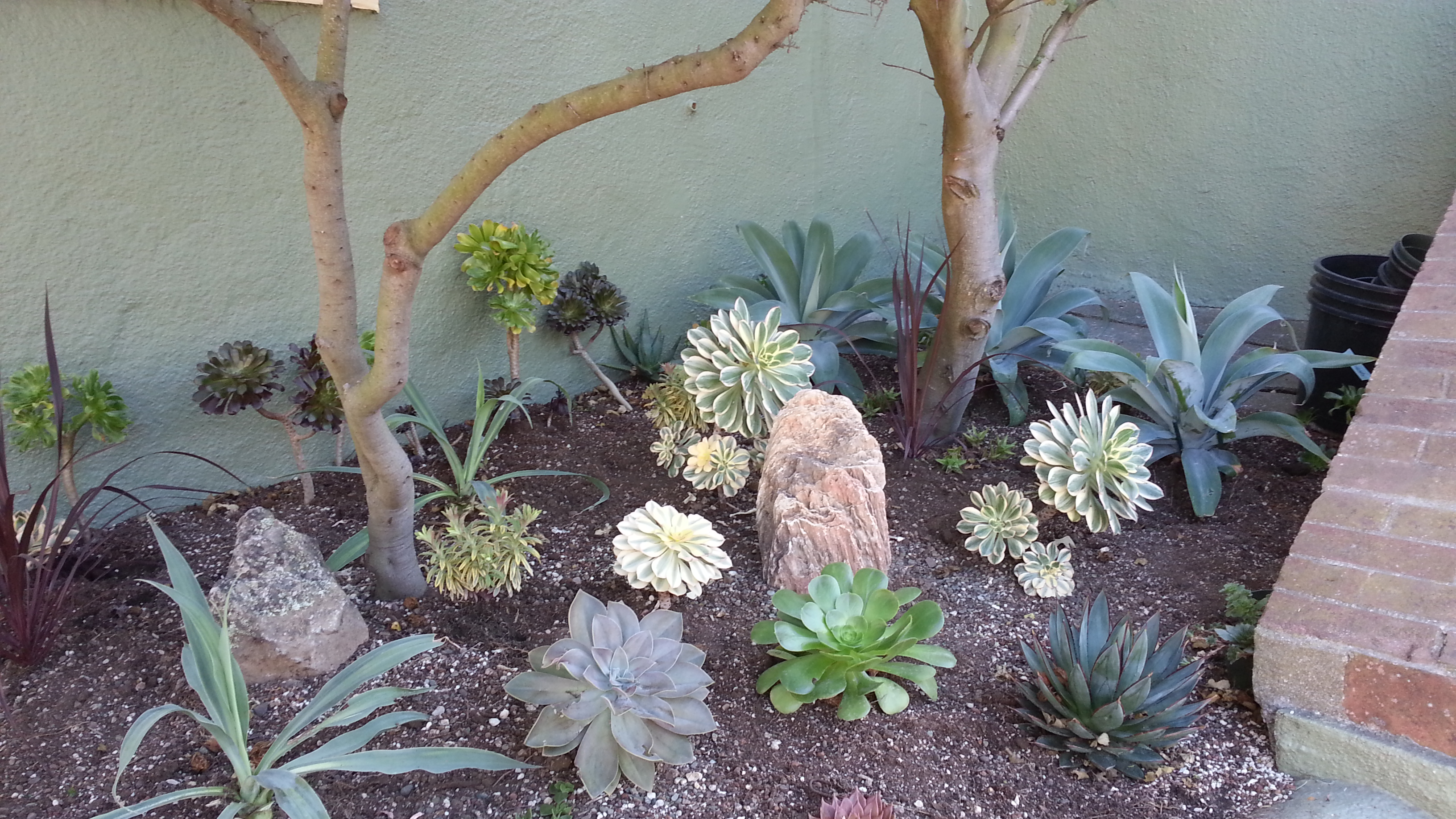 The agaves in the back corner do the trick of hiding a cement pad, and add a bright splash of blue-grey.