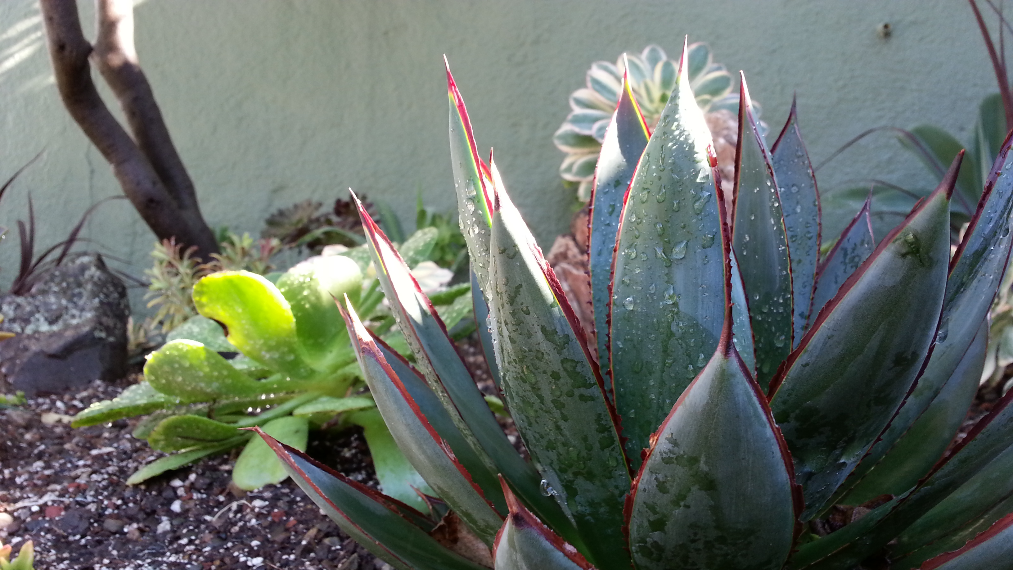 Red margins on Agave ‘Blue Glow’ mimic the burgundy of the cordylines and some of the aeoniums.