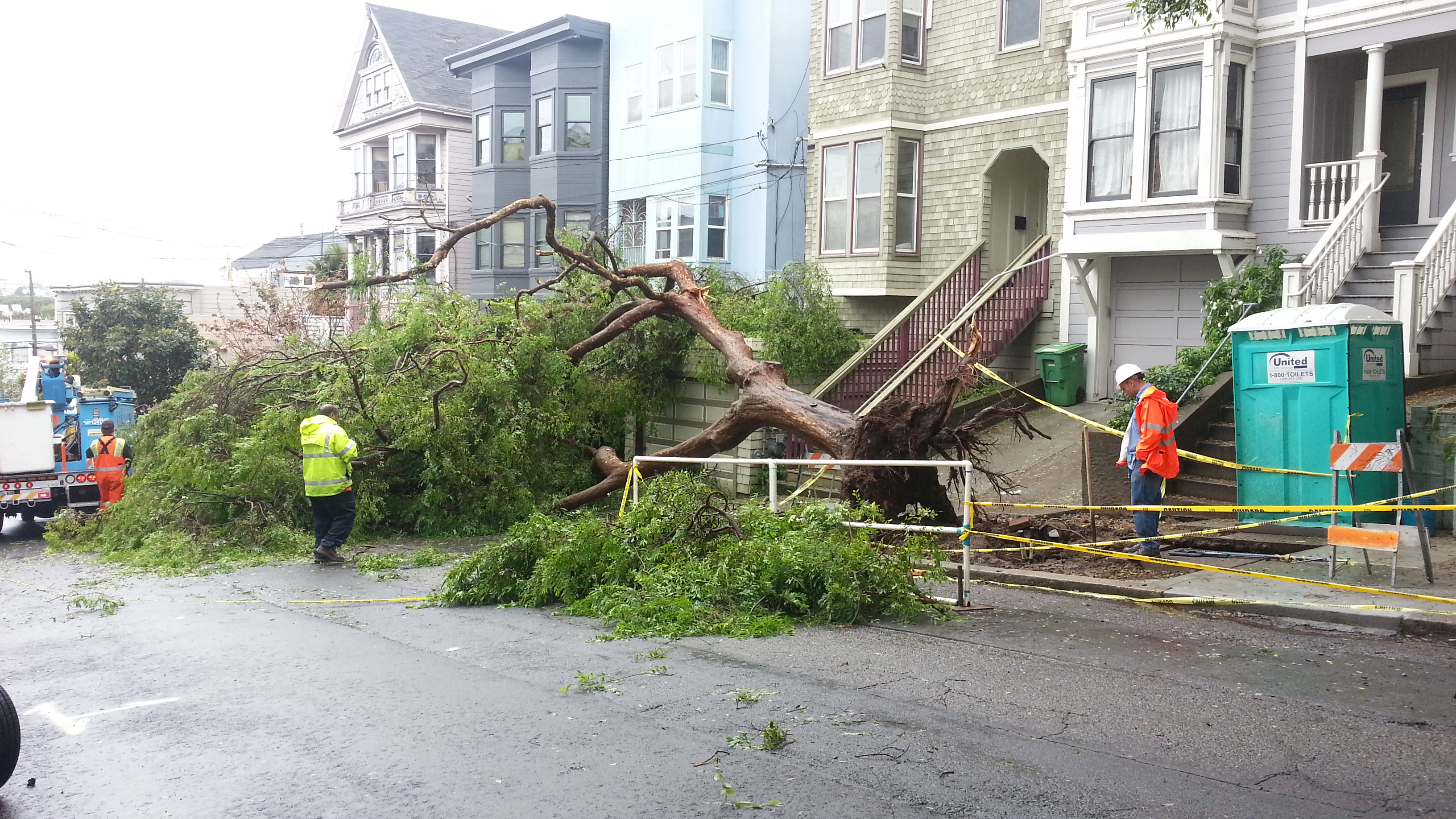 The block was cordoned off while PG&E came in to shut off the power and the gas. Residents were offered a Muni bus for shelter around the corner since it was still raining so hard. Once the gas was off, the electricity could be restored, the pipe was repaired, the tree was dismantled and hauled away, and the street once again opened to the residents. The torn pipe actually yanked the gas main out of alignment, and the street had to be dug up to replace a section of the main. It’s amazing how fast all this work can happen in an emergency situation.