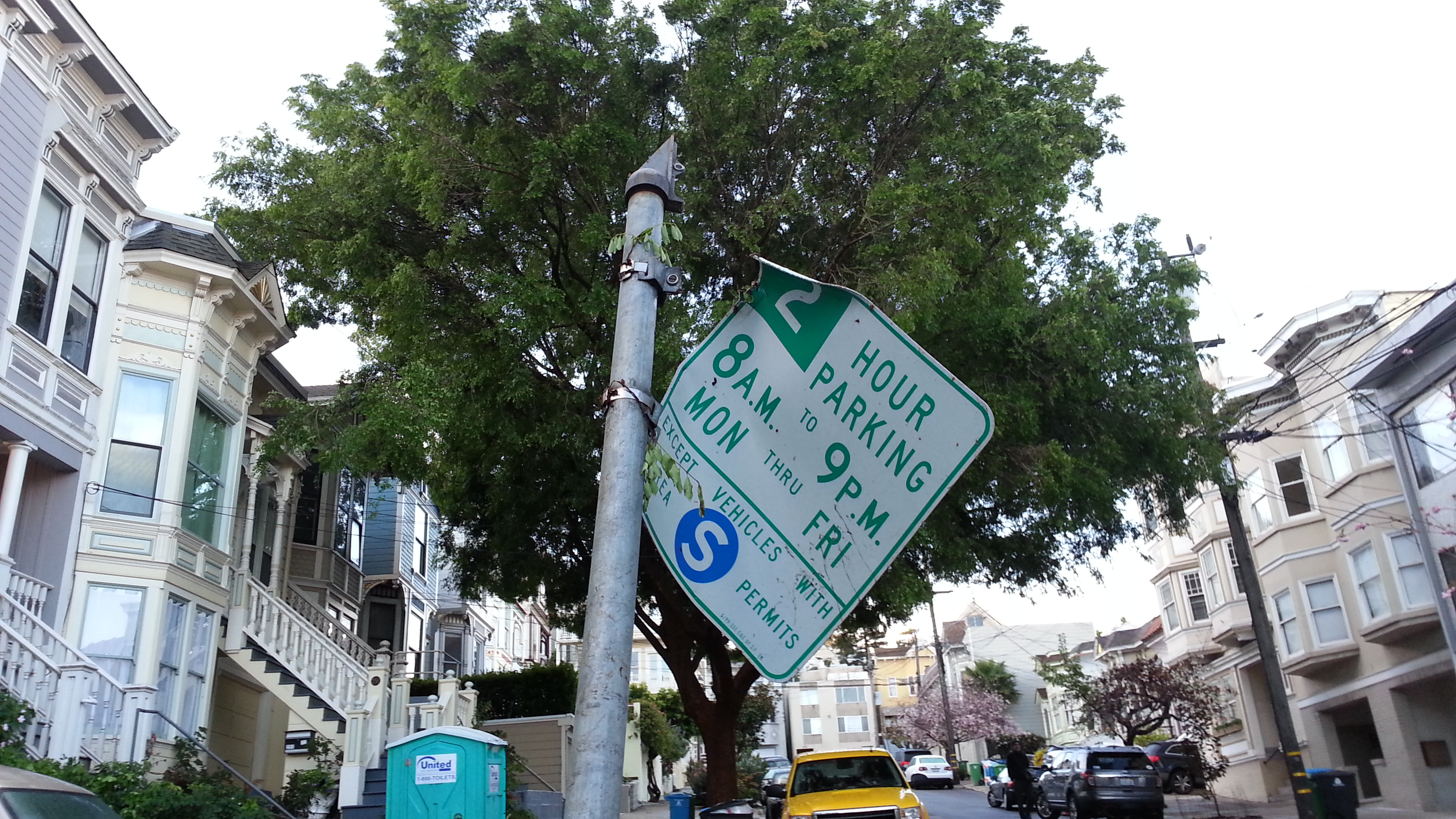 Fortunately, nobody was hurt, there was no explosion, and not even a car was hit by the tree! The only damage was to sections of sidewalk and this parking sign. Everybody will be keeping an eye on the other tree, though, for sure.