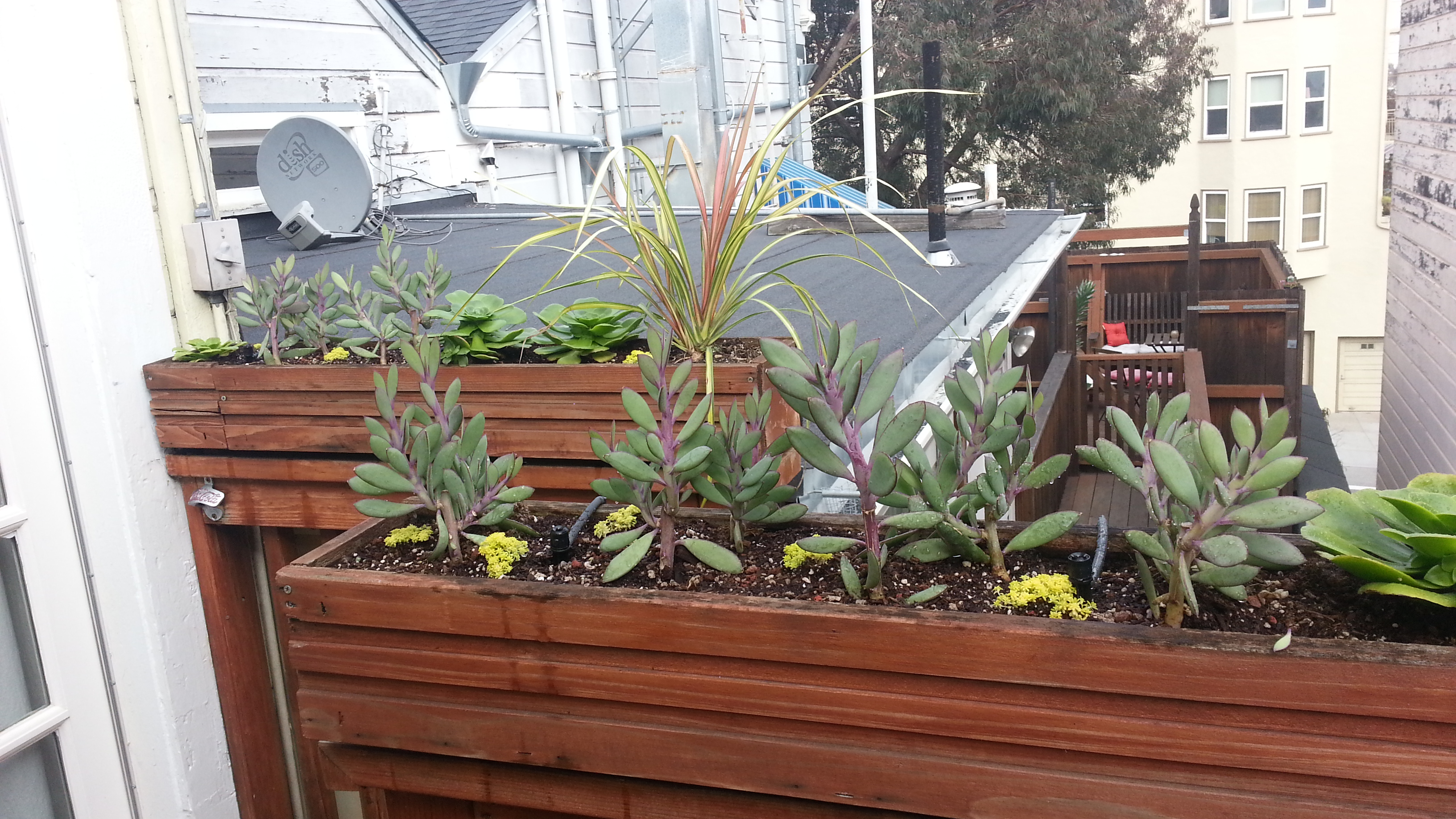 The clients had built little built-in troughs out of repurposed window boxes, lining the railings of their back deck. They had planted boxwood a year earlier, which is quite drought-tolerant in the ground, but it did not survive in this setting. Intense heat (by SF standards), no irrigation, and wind took their toll on the plants, and they shriveled and dried.