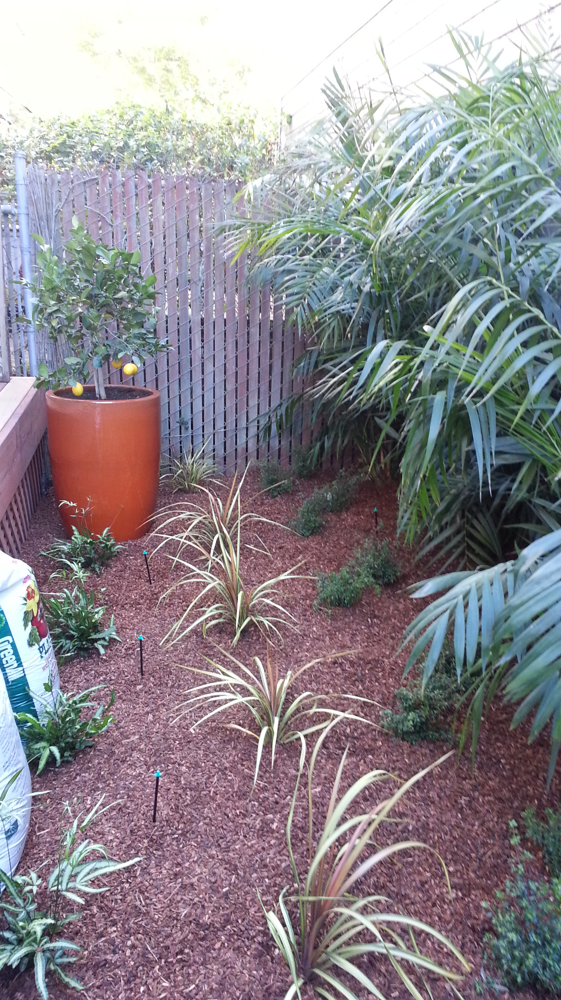 Facing eastward in the newly planted garden. That far right corner is where the chairs had been on the original little deck.