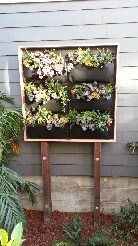You can see one orange bract of fruit on the palms next to the vertical garden.