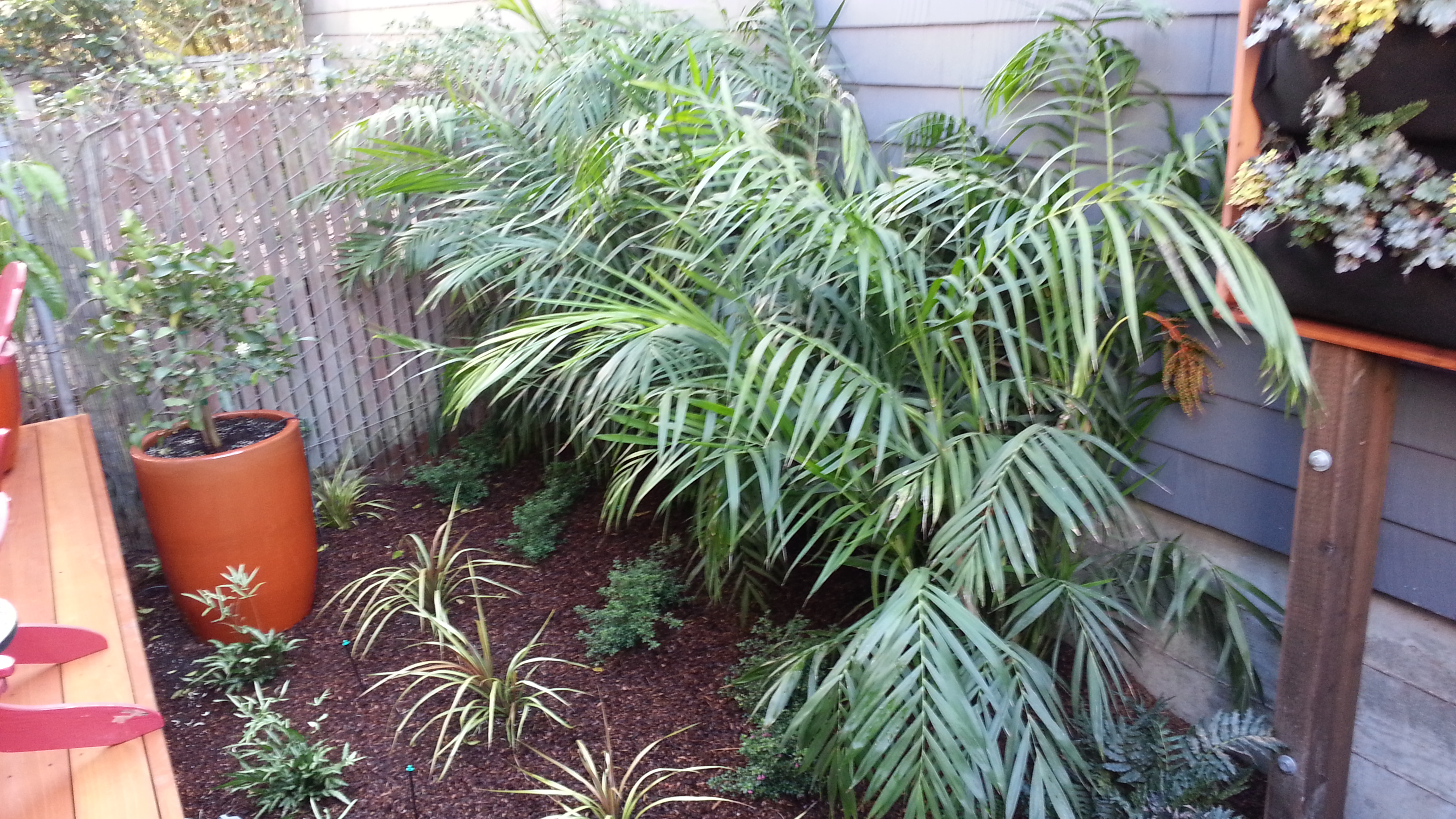 Rotating slowly westward, the bamboo palms soften the wall of the neighboring house.